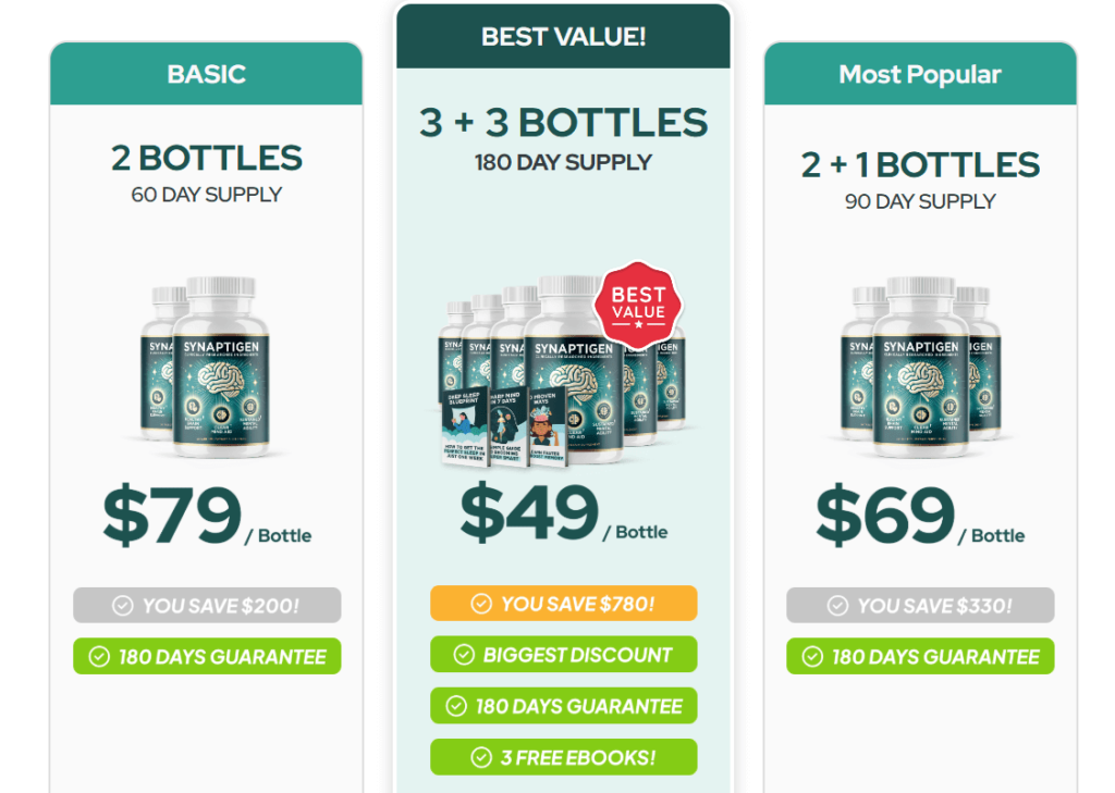 In addition to the 180-day money-back guarantee, the Official Synaptigen Website offers 3 exclusive bonuses for those who purchase 3 or 6 bottles of the supplement.
