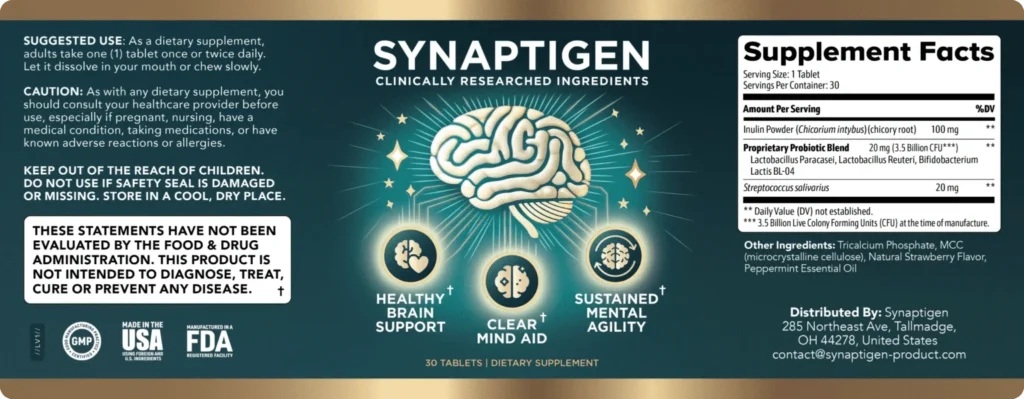 Unlike temporary focus boosters, Synaptigen’s formula is designed for lasting mental wellness. Its combination of probiotics, prebiotics, and plant-based extracts helps protect neurons from oxidative stress, promoting healthy brain aging and mental agility well into later years.