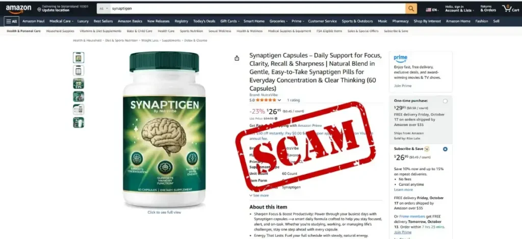 Unfortunately, some customers have reported being scammed when purchasing Synaptigen from unofficial websites. These counterfeit versions often appear cheaper but contain fake ingredients that do not match the original formula — and could even be unsafe.